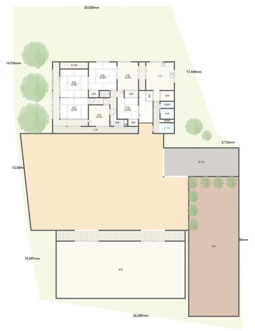 約208坪の広々の宅地に、約35坪の古民家が建っています。
