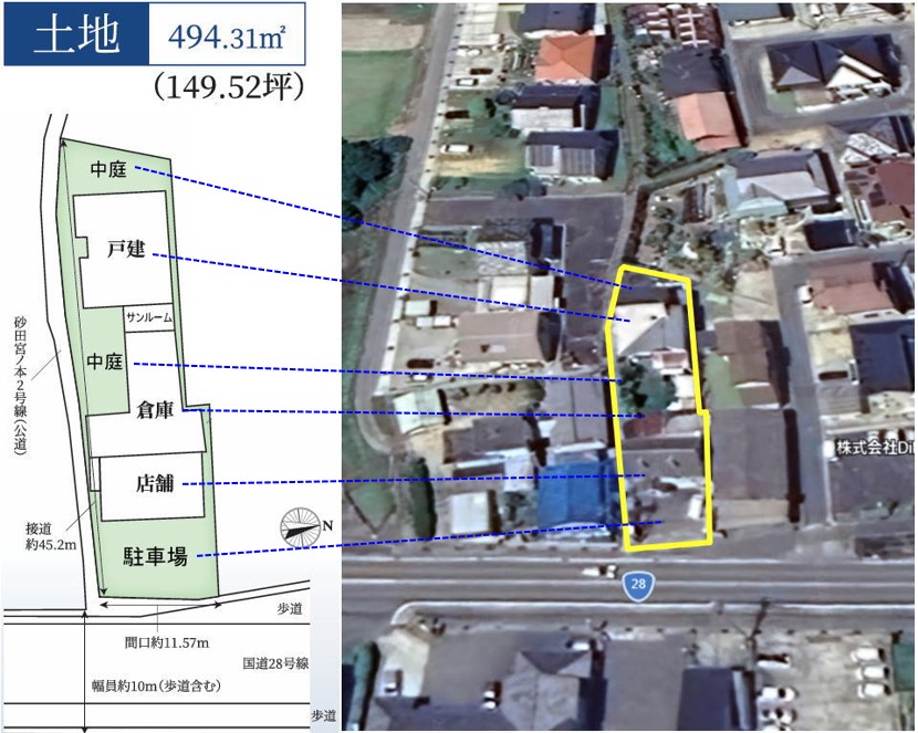国道28号沿い:集客に強いロードサイド物件。駐車場や中庭も完備。